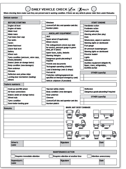 On the reverse side of the daily log is a new improved vehicle inspection report. All the driver needs to do is simply tick off each item, indicating whatever needs attention. So you ensure roadworthiness and safety while avoiding heavy fines. There is also provision to record body damage.