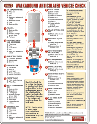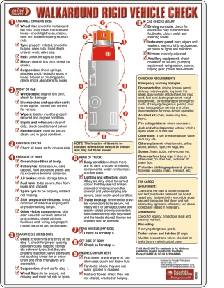 Walkaround Heavy Vehicle Check Especially practical where wall space is at a premium such as in training rooms, staff rooms, rest rooms, passageways, high traffic areas, bathrooms, etc. They are rigid and lay flat so mounting them is simple - no frames needed. These charts help ensure that the checks are properly carried out. To make it easier our Driver's Daily Log> incorporates a daily check list on the reverse side.